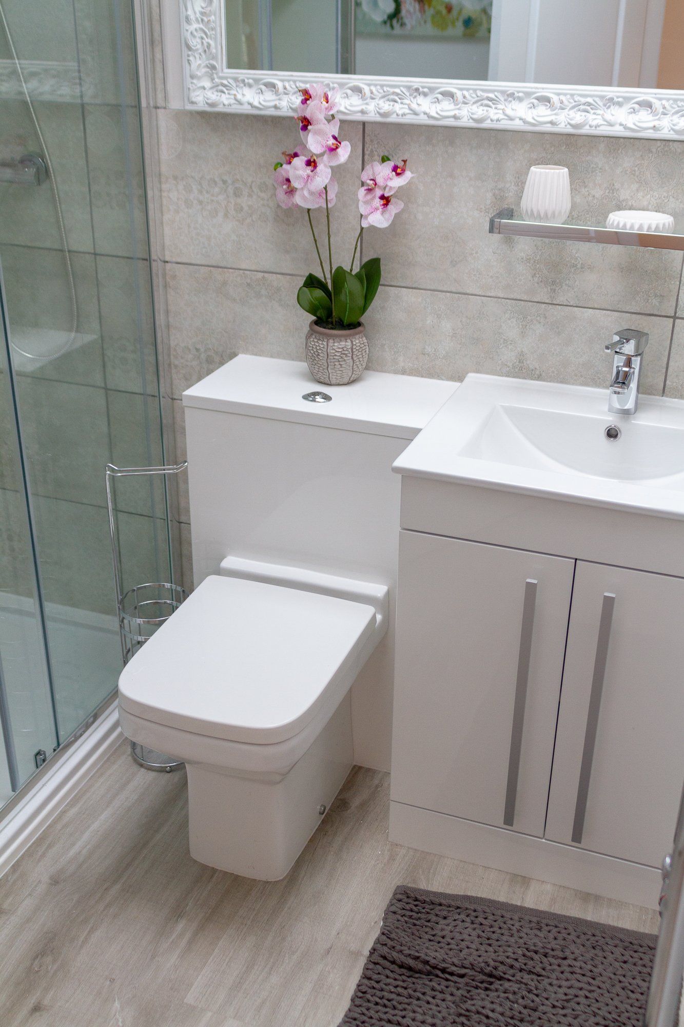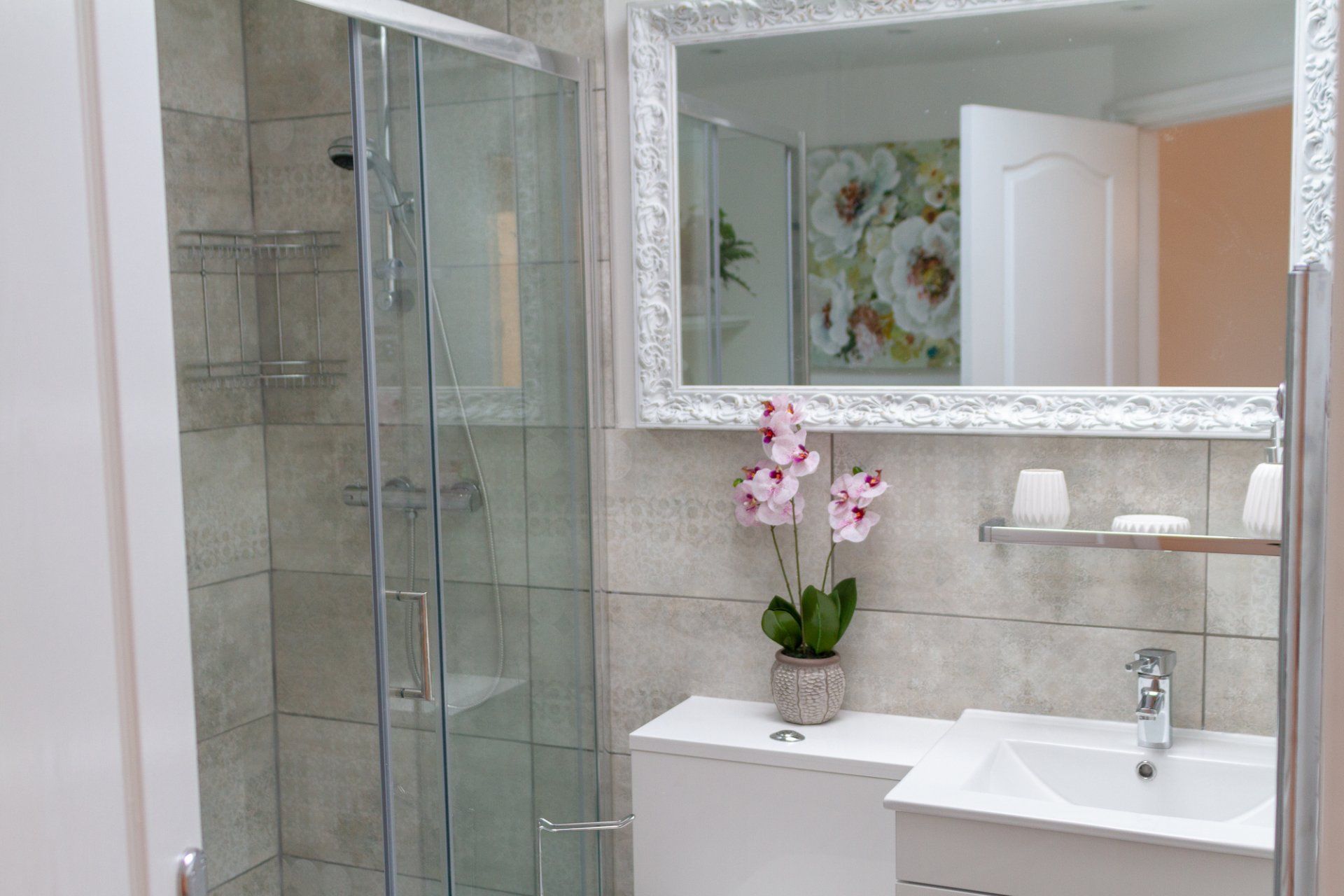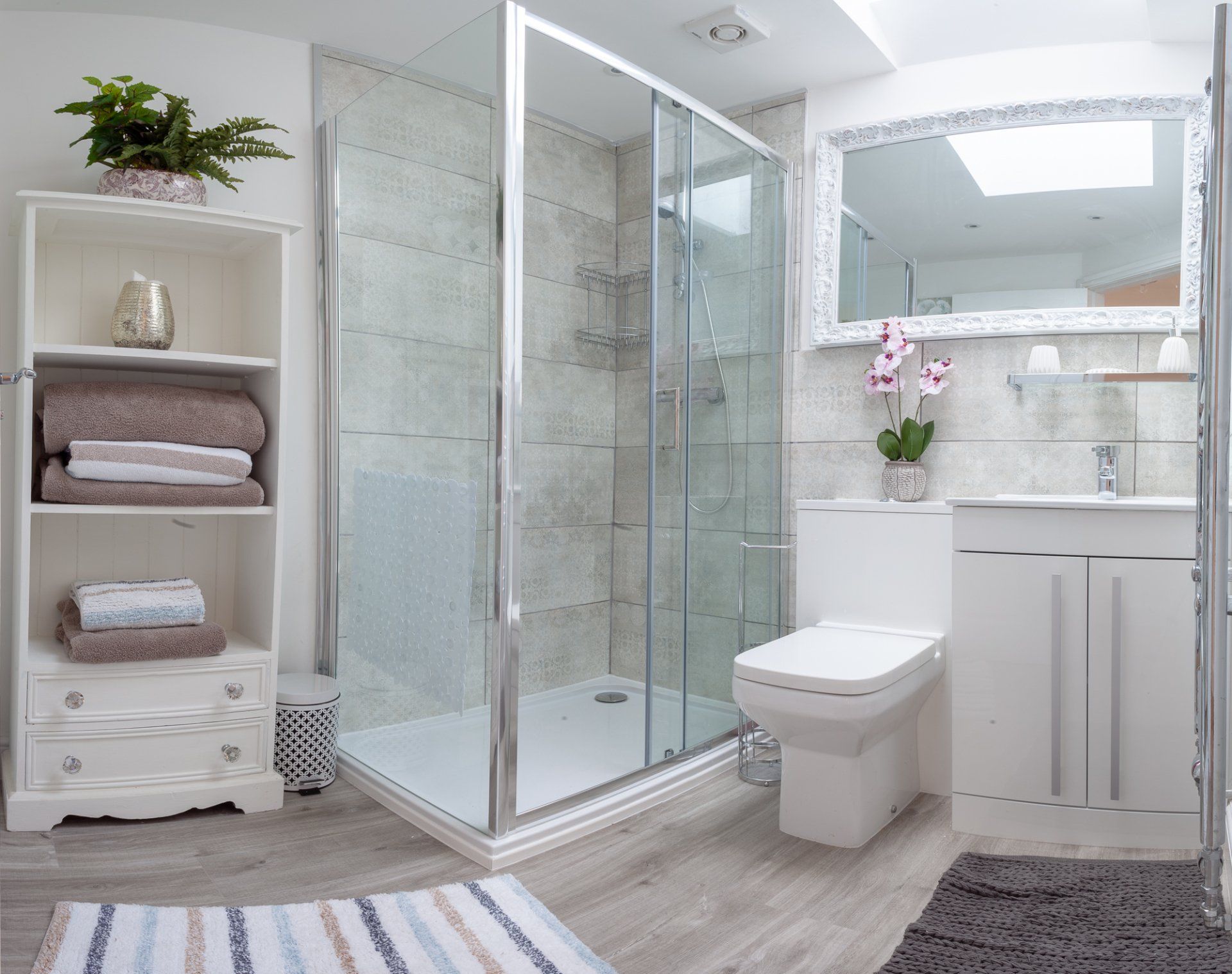 We have a large rectangular shower, sink, a toilet and heated towel rail.